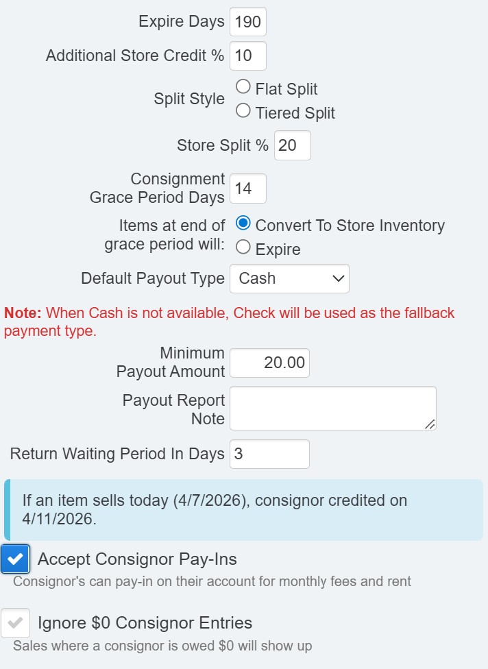 The default payout type that will be pre-selected when creating consignor payouts. This setting allows each location to specify which payout type should be used as the default option in payout drop downs.