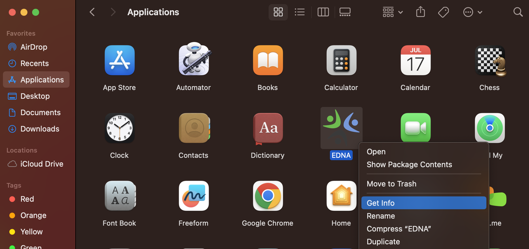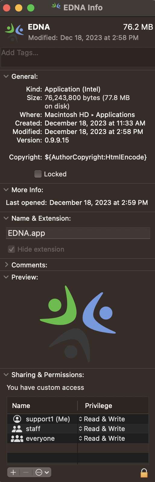 4. Check the permissions on EDNA. Right-click EDNA (Go to the Finder click Applications) and click 'Get Info'.