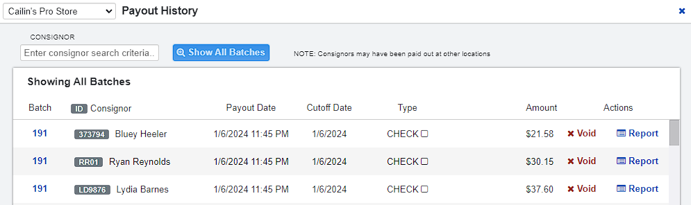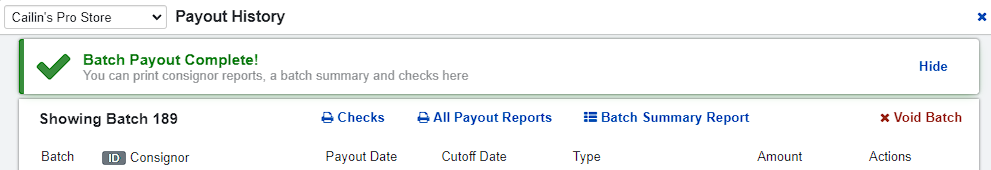 In order to reprint checks for a previously completed payout batch you'll want to navigate to Payout History. Find the batch in the list and select the batch number on the left.