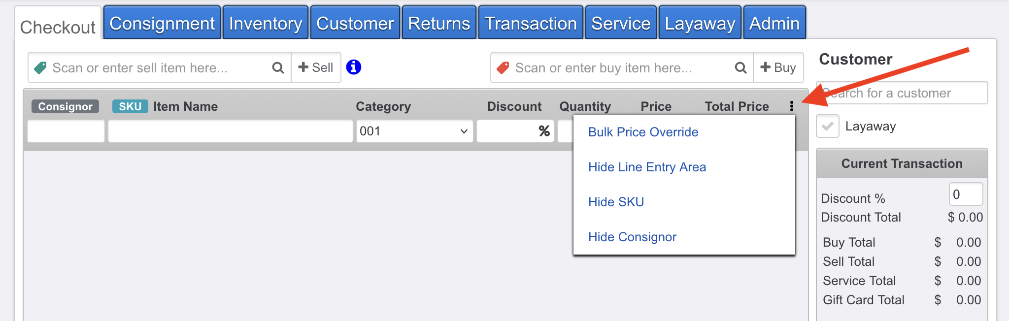 Turn on Hide Line Entry Area to collapse the large line-entry panel and show more of the transaction list. This is handy on smaller screens or when you only scan or add items and don’t need the entry controls visible.