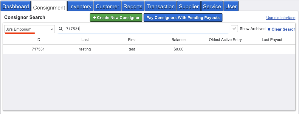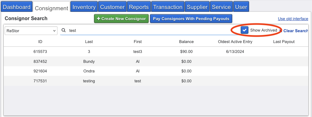 A: Make sure you’ve enabled the filter/toggle to Show Archived on the Consignment/Consignors list; archived accounts are excluded from search by default.