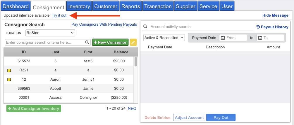 Note: The Show Archived checkbox does not show on the older consignment view, if you are on the older view and want to see archived consignors you have to click on the "Updated interface available, Try it out" link at the top of the Consignment view. Once included, you can open the archived consignor profile to view history, change status, or perform deletion.