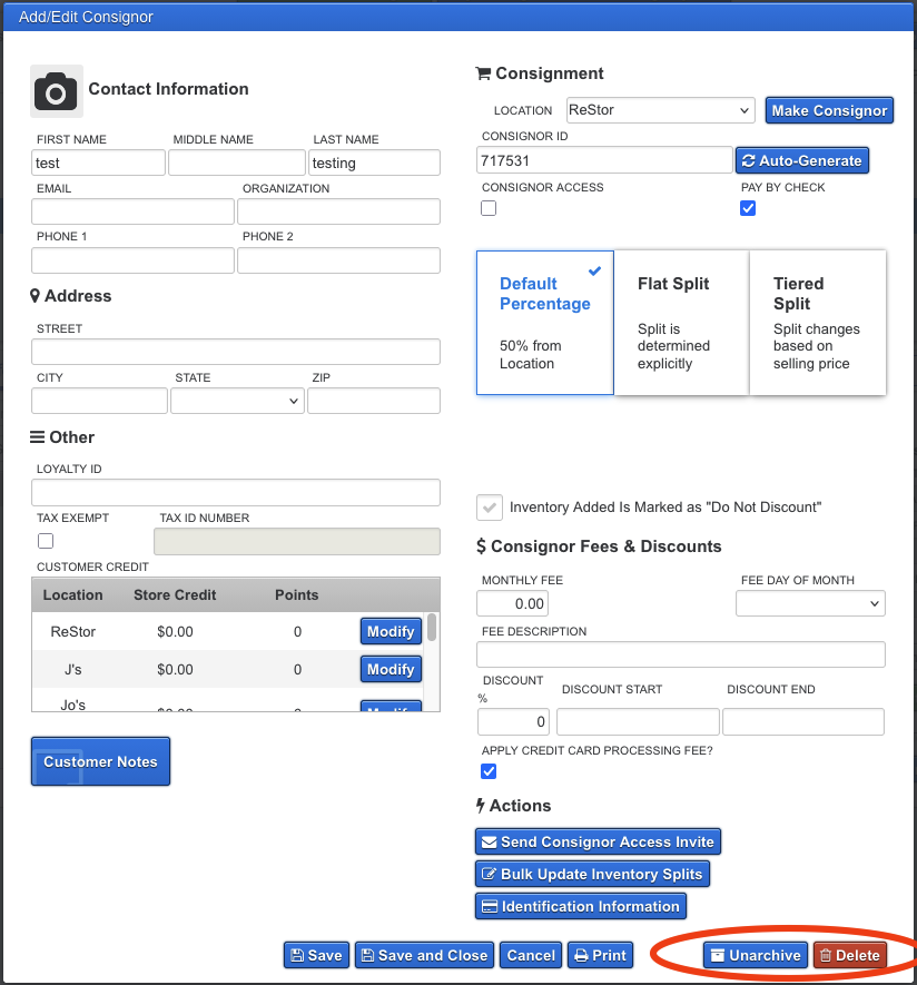 Open the consignor’s profile and click Unarchive.