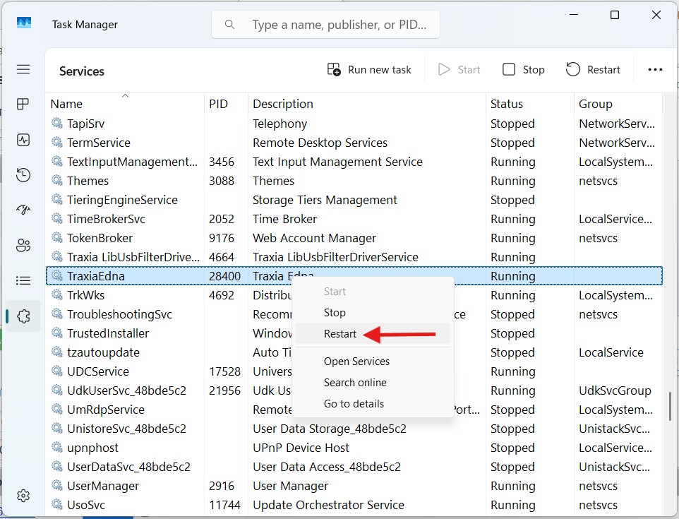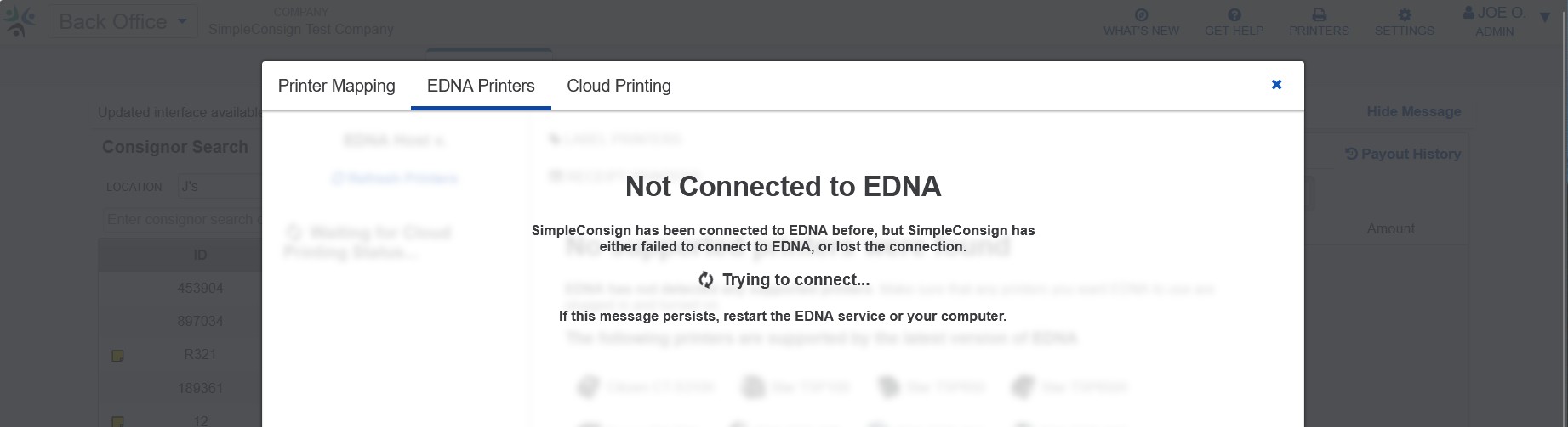 If you see this message when you click on Printers > EDNA Printers you'll need to manually restart our print service. Follow these steps: